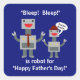 Are you looking for a Father's Day sticker? This sticker features a dad robot and a son robot. The son robot is saying, "Bleep! Bleep!". The rest of the text says, "Bleep! Bleep!" is robot for "Happy Father's Day!"