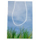 Golf bag and clubs with white ball in grass on sky background for Father's Day.
