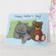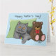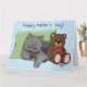 Cute grey cat with toy and teddy bear wishing their cat Mum a Happy Mother's Day.
