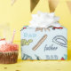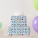 Illustrated collage of common shed and gardening tools on Father's day gift wrap.