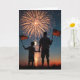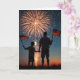 A young boy and a man stand in silhouette against a backdrop of vibrant fireworks, each holding an American flag for Father's Day.