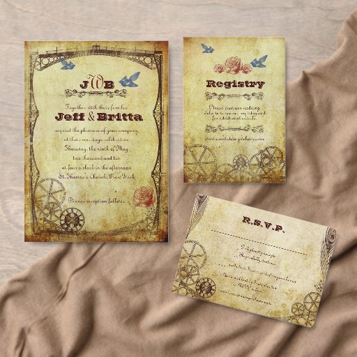 An elegant Victorian Steampunk themed wedding invitation suite featuring a mix of industrial elements and vintage illustrations of birds and roses. On the back is a heart made up of rusty gears. The faux antique gold and velvety maroon background colours add an old-world touch.