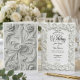Invite your guests to a celebration of timeless elegance with a design that whispers of royal grandeur and historical romance. Perfectly suited for a formal black-tie affair, this stationery captures the sophisticated beauty of classical sculpture in a modern format. The monochromatic palette ensures it complements any wedding color scheme while remaining distinctly luxurious.his design features a high-resolution digital print that simulates the tactile look of a 3D bas-relief or plaster carving. The artwork is characterized by swirling acanthus leaves, blooming roses, and an ornate baroque frame rendered in shades of white, ivory, and cream with soft grey drop shadows to create a convincing trompe l'oeil depth effect. The typography is a mix of elegant black calligraphy for names and traditional serif fonts for details, set against the faux-sculpted background. The reverse side (or pattern area) displays a continuation of the dense floral scrollwork featuring two interlocking wedding rings in the center, maintaining the simulated carved stone aesthetic. Note: The paper is smooth and flat; the texture is a printed visual effect only.