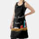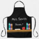 An all over print apron designed for teachers with a faux chalkboard background , a few books , a red apple and a chalk . Personalise it with the teacher's name and room number .
