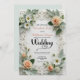 Designed for couples who appreciate timeless beauty, this elegant floral design sets a refined tone for a meaningful celebration. Soft colors and graceful details create a romantic first impression that feels classic yet welcoming. Ideal for spring or summer ceremonies with a formal, traditional atmosphere.The design features a centered vertical layout framed by a printed faux embossed ornamental border with symmetrical scrolling flourishes. Watercolor-style roses and daisies appear in blush peach, cream, and sage green, layered with muted gray foliage accents. Text is arranged in clear hierarchy using an elegant script for names, a bold decorative script for the main heading, and a readable serif for details, all printed in charcoal and soft black tones for strong contrast and accessibility.