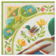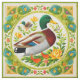 Faux Embroidered and Quilted Look Mallard Duck with circular border of blue and pink flowers.