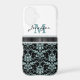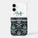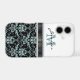 Add a little bling to her life with this exquisite phone case featuring a pretty aqua teal and black damask pattern on the bottom of the case, and her monogram and name in matching teal and black on the top. The two sections are separated by a black faux ribbon bordered with glittery faux diamond edging that gives special sparkle to the case! *Please note that the image is printed, and contains no actual ribbon, glitter, or gems.