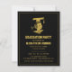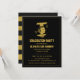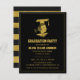 A graduation party invitation in faux gold and black. It has a outline silhouette of a girl wearing a graduate mortar hat with her hair tied in a pony tail. On the reverse is uneven horizontal stripes. Personalise with your graduation party details.