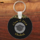 A personalised keychain which says: Class of 20xx. Designed with fake gold confetti glitter. Set on a black background. Illustrated with a black graduation cap with a semi-transparent circle behind. Elegant and chic.