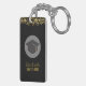 A keychain which says: Class of 20xx. The back can be personalised with your name and phon number or other text. Designed with fake gold confetti glitter. Set on a black background. Illustrated with a black graduation cap with a semi-transparent circle behind. Elegant and chic.
