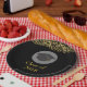 A paper plate which says: Class of 20xx. Designed with fake gold confetti glitter. Set on a black background. Illustrated with a black graduation cap with a semi-transparent circle behind. Elegant and chic.