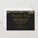 A stylish graduation thank you card designed with fake gold confetti glitter. Set on a black background. Illustrated with a black graduation cap. Elegant and chic.