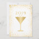 Invite your New Years Eve party guests in style with the holiday invitation. This design features a white background with faux gold sparkles and confetti sprinkled above and below the words "Happy New Year! 2019". The back of the card has a border of confetti and a gold cocktail glass in the centre. Designed by artist © Susan Coffey.