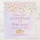 Wedding wine bottle label with fake gold confetti sprinkled along the top. 2 golden wedding rings below your personalised text. A pale purple and yellow watercolor background.