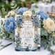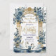 This design features a pair of graceful white swans with outstretched wings, framed by a classical architectural archway and columns. The composition is adorned with a romantic watercolor bouquet of slate blue and dusty blue roses, interspersed with soft gray eucalyptus foliage. The background simulates a refined marble texture in soft ivory, accented by a printed yellow-gold geometric frame. The typography combines a flowing handwritten script with traditional serif fonts for a timeless aesthetic.This is a flat printed image with a Faux Gold Foil and Marble effect, not actual raised metal or stone material.