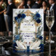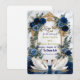 Set the tone for a fairytale celebration with this sophisticated stationery suite. Perfect for announcing a formal royal blue wedding with elegant romance.This design features a pair of elegant white swans facing one another, creating a gentle heart shape over a reflective water effect. The scene is framed by an ornate, faux gold foil baroque crest intertwined with lush watercolor florals. The botanical arrangement showcases deep navy and royal blue roses, accented by dusty blue blooms and soft sage green eucalyptus foliage. The background simulates a soft gray marble stone texture for a luxurious finish. The typography combines a flowing, handwritten calligraphy script with a classic serif font. This is a flat printed image with a printed gold foil and marble texture effect, not actual raised foil or stone material.