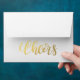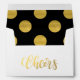 A charming glam envelope with big golden faux glitter polka dots on black background inside and big "cheers" typography brush script o outside back bottom. Suitable for glamourous bachelorette parties, bridal showers, New Year parties and greeting cards, birthdays and anniversaries.