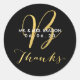 Gold "Thanks" Calligraphy Script on Black Background Personalised with Gold B Monogram Initial - Wedding Thank You Sticker. The monogram initials are available at www.zazzle.com/monogramgallery