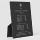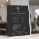 Elegant plaque with easel displays your salon services or price list in classic white lettering on a rich charcoal grey background adorned with a tropical faux gold palm tree illustration. Includes three customisable headings and body text fields. To adjust layout, enter your text and then use the Customise function to change positioning and font sizes.