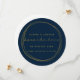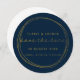 A modern save the date announcement featuring modern script and sans serif font in navy and gold.