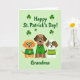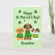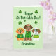 Designed with three cartoon-style puppies lined up along the lower part of the card, the scene feels friendly and a little sweet as they lean close together like pals posing for a photo 💚. Each pup wears green-rimmed glasses and its own green outfit, including a striped sweater on one and a bandana dotted with small shamrocks on another. Warm brown and orange fur tones add contrast against a soft pastel green background. Near the top, the text “Happy St. Patrick’s Day!” sits centered in green lettering, with small shamrock accents tucked between the words ☘️. A smaller “Grandma” dedication appears above or near the main greeting in a darker green, giving the layout a gentle, affectionate focus without crowding the art. The puppies’ wide eyes and slight smiles, plus their shoulder-to-shoulder spacing, suggest a caring bond that reads like friendship with a hint of family closeness. Little shamrocks repeat across the outfits and around the headline, echoing the green theme from lime to deeper forest shades.