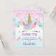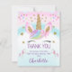 Cute unicorn birthday thank you card with a little bling. This design features a unicorn face, two clouds, some heart and faux gold stars, a banner and 2 small unicorns. The background includes a faint blue and pink rainbow. A great way to thank your little girl's guests for coming to her party.