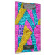 Faux patchwork quilt inspired pink, yellow, and blue pattern on front and back with name inside grey rectangle at front.