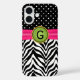 Turn heads with this Faux Ribbon Jewel Zebra Dot Pattern Monogram iPhone 16 Case by Socialite Designs. Featuring a fierce zebra print layered with playful polka dots, this design is topped with a faux ribbon and jewel accent that adds sparkle without the bulk. A customisable monogram banner makes it uniquely yours—perfect for fashionistas who love bold style with a touch of bling.