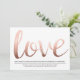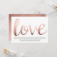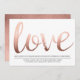 This wedding invitation features a hand-lettered look brush script type with a faux rose gold foil texture.