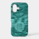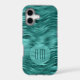 On this phone case, your double digit monogram in dark teal is placed on a semi transparent lighter teal blue circle banner. The banner is on a pretty background of faux teal foil abstract waves. Shimmery, and sure to be noticed.