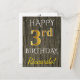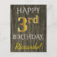 This simple, personalised birthday postcard design features the message "HAPPY 3rd BIRTHDAY", with the "3rd" having a faux gold-like appearance. The front also features a personalised name, and a faux wood look background. The back features a personalised birthday message, along with the customisable address of the birthday postcard recipient. It could be given to somebody who is celebrating their third birthday. [~Z0000066]