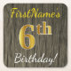 Faux Wood, Faux Gold 6th Birthday + Custom Name Square Paper Coaster