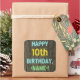 This fun birthday-themed sticker design features a message like "HAPPY 10th BIRTHDAY, <NAME>!", where the name can be personalised. The background features a rustic, brown, faux wood grain appearance pattern. The customisable message text features colours like blue, yellow, and green, and it has an appearance inspired by that of painted, stenciled lettering. Stickers like these could perhaps be given as a gift, or perhaps be used as decorations at a birthday party being held for somebody who is celebrating their tenth birthday. [~Z0000296]