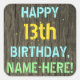 This fun birthday-themed sticker design features a message like "HAPPY 13th BIRTHDAY, NAME-HERE!", where the name can be personalised. The background features a rustic, brown, faux wood grain appearance pattern. The personalised message text features colours like blue, yellow, and green, and it has an appearance inspired by that of painted, stenciled lettering. Stickers like these could perhaps be given as a gift, or perhaps be used as decorations at a birthday party being held for somebody who is celebrating their thirteenth birthday. [~Z0000296]