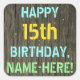 This fun birthday-themed sticker design features a message like "HAPPY 15th BIRTHDAY, NAME-HERE!", where the name can be personalised. The background features a rustic, brown, faux wood grain appearance pattern. The personalised message text features colours like blue, yellow, and green, and it has an appearance inspired by that of painted, stenciled lettering. Stickers like these could perhaps be given as a gift, or perhaps be used as decorations at a birthday party being held for somebody who is celebrating their fifteenth birthday. [~Z0000296]