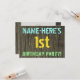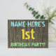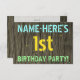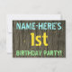 This fun birthday party invitation design features a message like "NAME-HERE’S 1st BIRTHDAY PARTY!", where the name can be personalised, on the front. The background features a rustic, brown, faux wood grain appearance pattern. The customisable message text on the front features colours like blue, yellow, and green, and it has an appearance inspired by that of painted, stenciled lettering. The back features a customised message that could include important details about the birthday party, such as when and where it is being held, along with any other information that is relevant. Birthday party invitations like this might be a fun way to invite family and friends to a birthday party being held for somebody who is celebrating their first birthday. [~Z0000291]