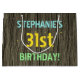 This fun birthday gift bag design features a message like "STEPHANIE’S 31st BIRTHDAY!", where the name can be personalised. The background features a rustic, brown, faux wood grain appearance pattern. The customisable message text features colours like blue, yellow, and green, and it has an appearance inspired by that of painted, stenciled lettering. A birthday-themed gift bag like this might be a fun way to wrap a gift for somebody who is celebrating their thirty first birthday. [~Z0000319]