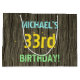 This fun birthday gift bag design features a message like "MICHAEL’S 33rd BIRTHDAY!", where the name can be personalised. The background features a rustic, brown, faux wood grain appearance pattern. The customisable message text features colours like blue, yellow, and green, and it has an appearance inspired by that of painted, stenciled lettering. A birthday-themed gift bag like this might be a silly way to wrap a gift for somebody who is celebrating their thirty third birthday. [~Z0000319]