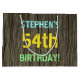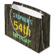 This fun birthday gift bag design features a message like "STEPHEN’S 54th BIRTHDAY!", where the name can be personalised. The background features a rustic, brown, faux wood grain appearance pattern. The customisable message text features colours like blue, yellow, and green, and it has an appearance inspired by that of painted, stenciled lettering. A birthday-themed gift bag like this might be a fun way to wrap a gift for somebody who is celebrating their fifty fourth birthday. [~Z0000319]