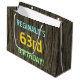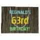 This fun birthday gift bag design features a message like "REGINALD’S 63rd BIRTHDAY!", where the name can be personalised. The background features a rustic, brown, faux wood grain appearance pattern. The customisable message text features colours like blue, yellow, and green, and it has an appearance inspired by that of painted, stenciled lettering. A birthday-themed gift bag like this might be a fun, silly way to give a gift to somebody who is celebrating their sixty third birthday. [~Z0000319]