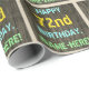 This fun birthday-themed wrapping paper design features a message like "HAPPY 72nd BIRTHDAY, NAME-HERE!", where the name can be personalised. The background features a rustic, brown, faux wood grain appearance pattern. The customisable message text features colours like blue, yellow, and green, and it has an appearance inspired by that of painted, stenciled lettering. Wrapping paper like this could perhaps be used when wrapping birthday gifts being given to somebody who is celebrating their seventy second birthday. [~Z0000293]