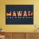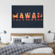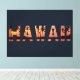 Bold “HAWAII” letters contain a glowing tropical sunset of warm oranges and pinks, with dark palm silhouettes and calm ocean below. The crisp typography and vibrant colours bring a laid-back island-evening feel that’s perfect for evoking sunset strolls on a Hawaiian shore.