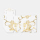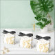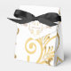 Shown is a tent style favor box in White with a fancy Golden-color printed heart pattern on it and floral-type print all over box. Embellished with a black ribbon bow at top. Newlyweds' names on each side of heart and the last name inside the heart.