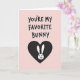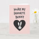 This greeting card features a soft blush pink background that sets a gentle, affectionate mood 🌷. Across the top, a casual black hand-drawn style line of text reads “YOU’RE MY FAVORITE BUNNY,” centered and easy to spot. The dark lettering stands out clearly against the pale backdrop, like a note left for someone you adore. In the lower half, a large solid black heart sits as the main focal point, suggesting closeness and devotion. Inside the heart, a simple white bunny face with long upright ears, tiny dot eyes, and a small curved smile adds a sweet, friendly touch 🐰. The strong contrast of black and white against pink keeps the design minimal while still feeling warm, like a quiet inside joke between two people. The layout feels balanced, with the message above and the heart-and-bunny illustration below. The bunny’s ears stretch upward within the heart, with the white shape crisp against the black silhouette.