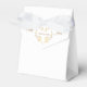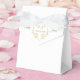 Shown is a tent style favour box in White with a fancy Golden-colour printed heart pattern on it. Embellished with a White ribbon at top. Newlyweds names on each side of heart and the last name inside the heart. Design on flap. Customise this item or buy as shown.