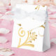 Shown is a tent style favour box in White with a fancy gold floral printed pattern on it. Embellished with a White ribbon at top. Customise this item or buy as shown.