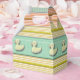 Layers of grosgrain and gingham ribbons and twisted satin cord run above and below a charming line of little "ducks in a row" . . . headed in either direction. The soft yellows, oranges and greens make this design a natural for babies and baby showers. As a favour box, you can fill it with candies or other confections or prizes for the guests of your baby shower. As a gift box, it's just big enough to fit the matching pacifier, also available in this collection, or a charming colour-coordinated newborn hat or booties.