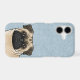 Destei's original cartoon illustration of an adorable fawn coat colour Pug breed dog's head close-up. The background colour is blue with a decorative texture. The texture can be removed and the background colour can be changed to any other colour, if so wished.