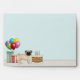 Destei's original cartoon illustration of an adorable fawn coat colour Pug breed dog. The dog is placed in a colourful birthday setting. There is a birthday cake with some candles on it, some colourful birthday balloons and two present boxes.