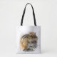 This tote bag features a cute little chipmunk who is stuffing his chubby cheeks as fast as he can. He has a black and white stripe down his back, white around the eyes, golden brown fur, and a pink nose.